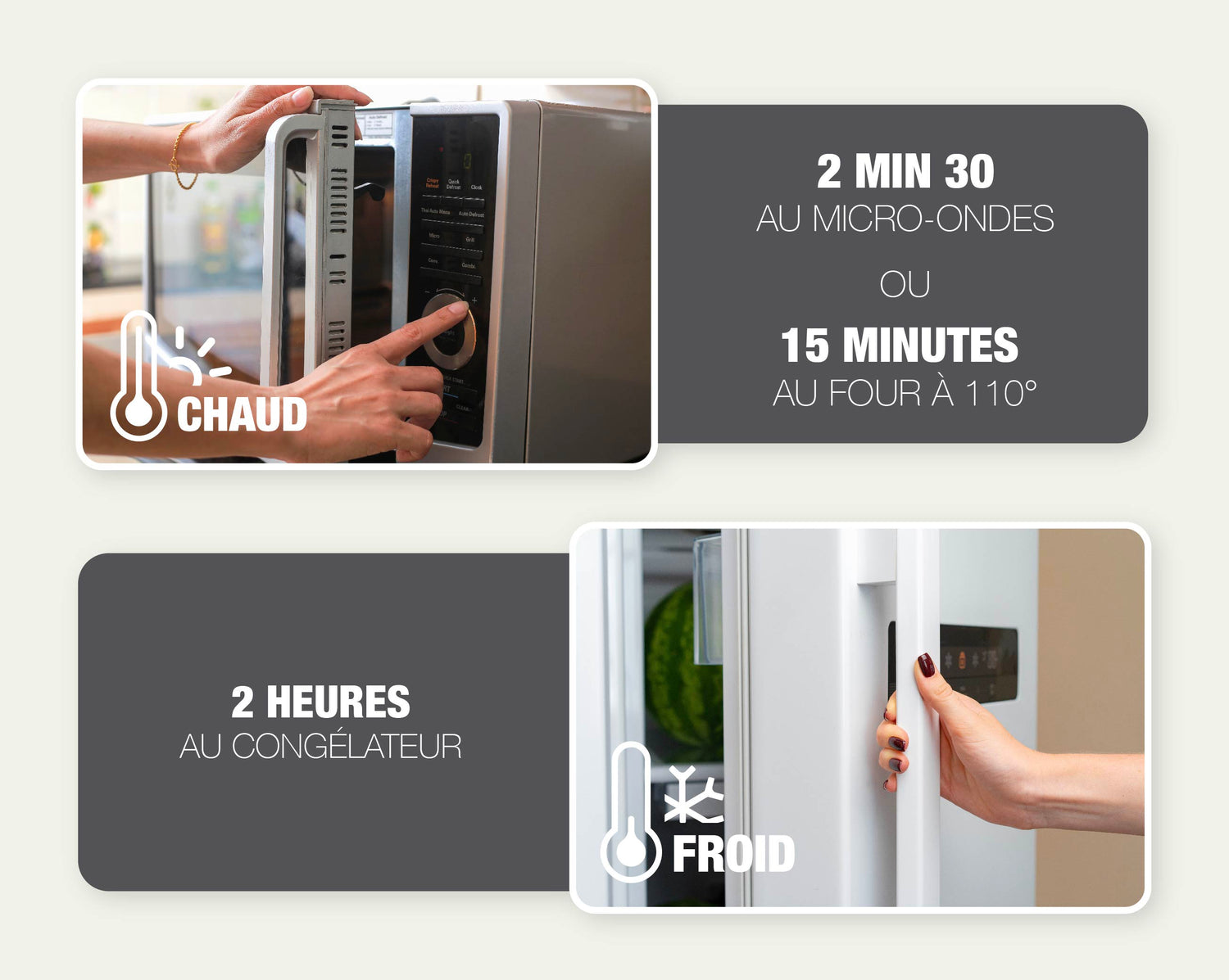 On sait que tu n'as pas de temps à perdre. Conçue spécialement pour ces moments délicats, elle t'apporte un confort immédiat. Notre bouillotte se chauffe en seulement 2 minutes 30 au micro-ondes, pour que tu puisses vite profiter de ses bienfaits. Et si c'est le frais que tu cherches, un petit tour au congélateur pendant deux heures et le tour est joué. Pratique, non ? C’est le remède parfait pour ces moments où tu as juste besoin de soulagement rapide et sans tracas.
