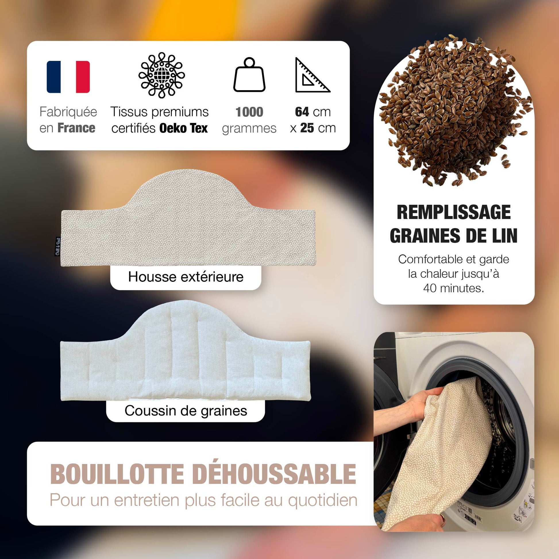 Elle garde la chaleur environ 30 minutes, juste assez longtemps pour te soulager et t'envelopper de confort. Et quand elle n’est plus assez chaude, tu peux simplement la réchauffer 2 minutes au micro-ondes.