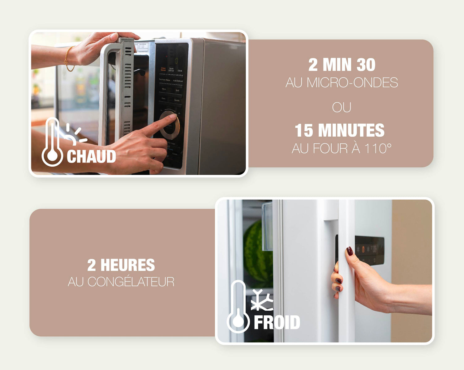 On sait que tu n'as pas de temps à perdre. Conçue spécialement pour ces moments délicats, elle t'apporte un confort immédiat. Notre bouillotte se chauffe en seulement 2 minutes 30 au micro-ondes, pour que tu puisses vite profiter de ses bienfaits. Et si c'est le frais que tu cherches, un petit tour au congélateur pendant deux heures et le tour est joué. Pratique, non ? C’est le remède parfait pour ces moments où tu as juste besoin de soulagement rapide et sans tracas.