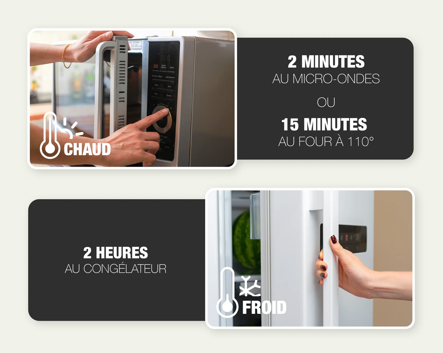 On sait que tu n'as pas de temps à perdre. Conçue spécialement pour ces moments délicats, elle t'apporte un confort immédiat. Notre bouillotte se chauffe en seulement 2 minutes au micro-ondes, pour que tu puisses vite profiter de ses bienfaits. Et si c'est le frais que tu cherches, place la au congélateur pendant deux heures et le tour est joué. Pratique, non ? C’est le remède parfait pour ces moments où tu as juste besoin de soulagement rapide et sans tracas.