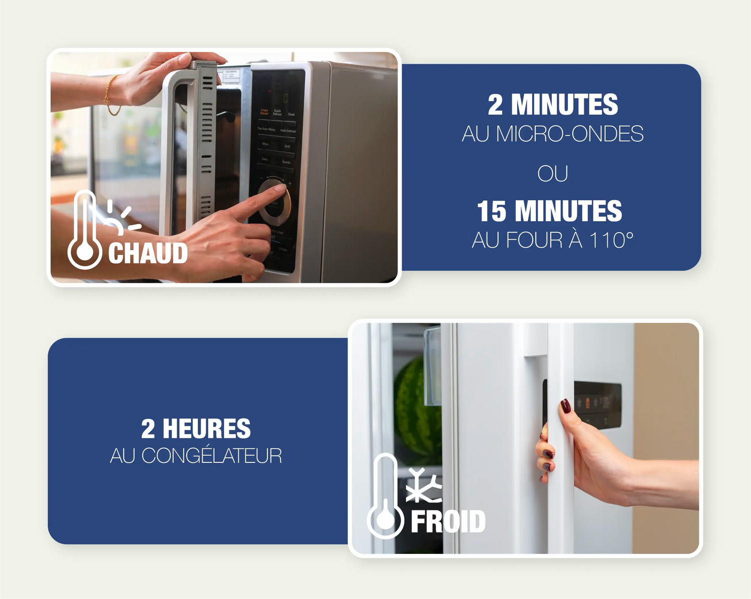 On sait que tu n'as pas de temps à perdre. Conçue spécialement pour ces moments délicats, elle t'apporte un confort immédiat. Notre bouillotte se chauffe en seulement 2 minutes au micro-ondes, pour que tu puisses vite profiter de ses bienfaits. Et si c'est le frais que tu cherches, place la au congélateur pendant deux heures et le tour est joué. Pratique, non ? C’est le remède parfait pour ces moments où tu as juste besoin de soulagement rapide et sans tracas.