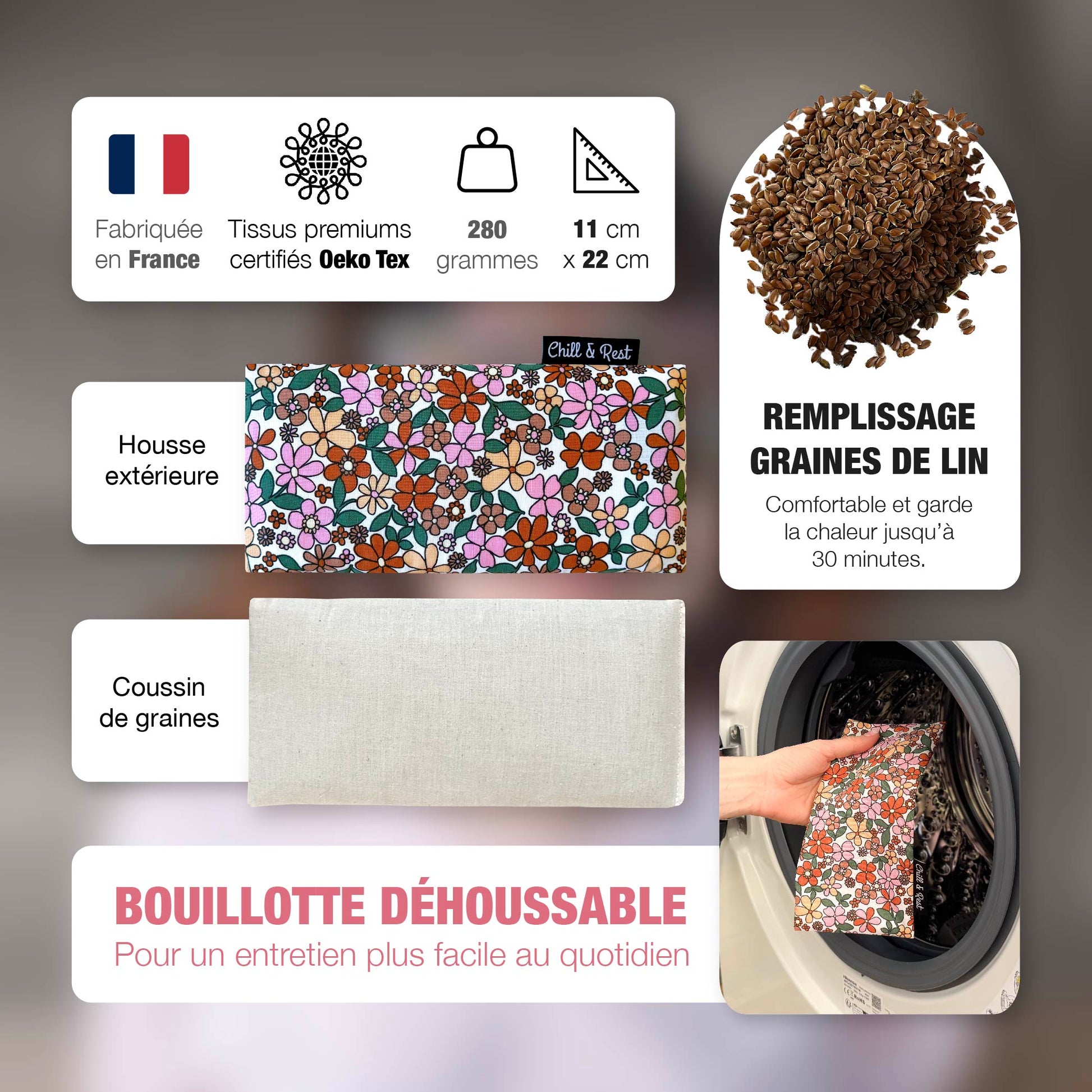 Elle garde la chaleur environ 30 minutes, juste assez longtemps pour te soulager et t'envelopper de confort. Et quand elle n’est plus assez chaude, tu peux simplement la réchauffer 2 minutes au micro-ondes.